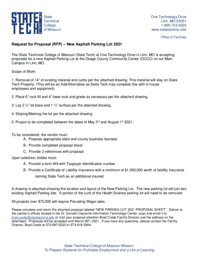 State Technical College of Missouri is accepting proposals for a new asphalt parking lot at the Osage County Community Center on its main campus. The project includes removal of existing material,