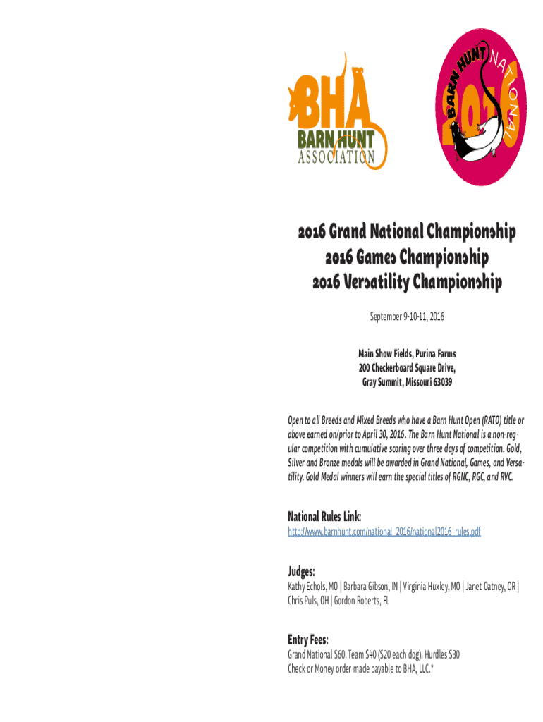 TIONALBARN2016 NT N A HU2016 Grand National Championship 2016 Games Championship 2016 Versatility Championship September 91011, 2016 Main Show Fields, Purina Farms 200 Checkerboard Square Drive, Gray
