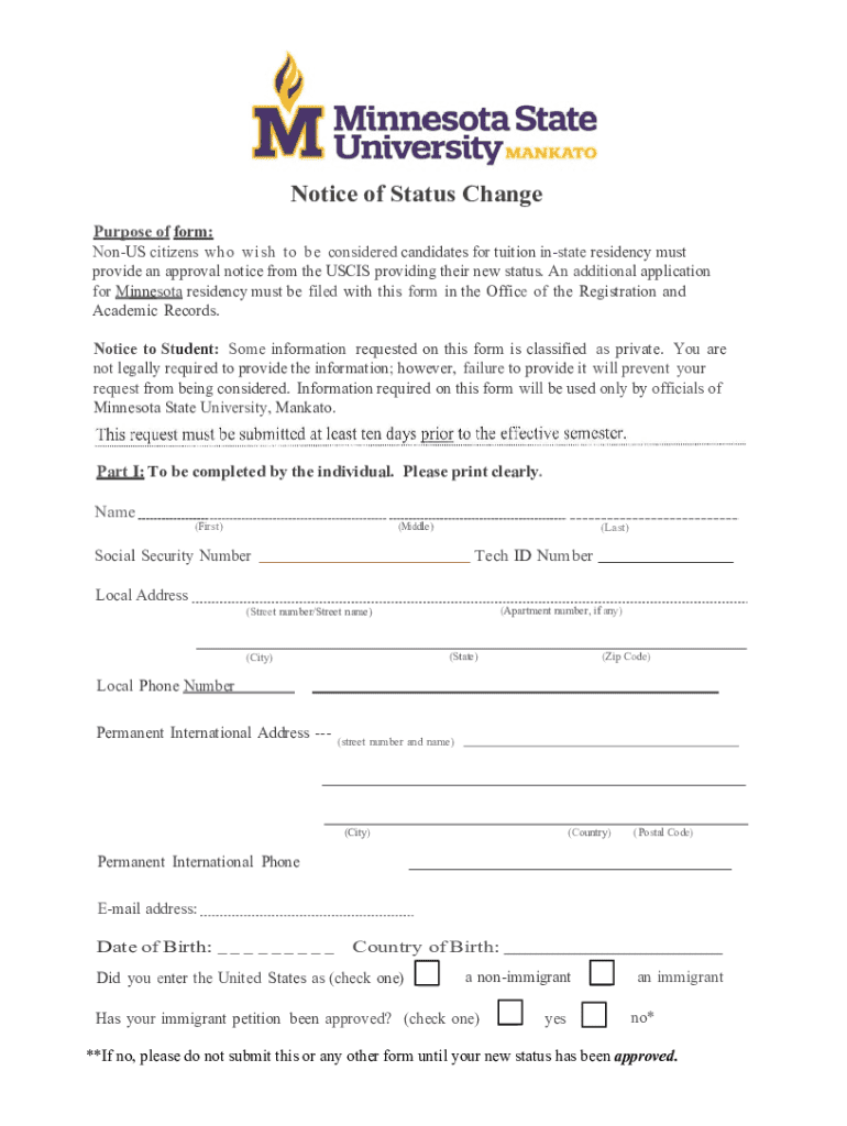 This form is intended for non-US citizens who wish to apply for in-state residency at Minnesota State University. It requires submission of an approval notice from USCIS for a change in visa status
