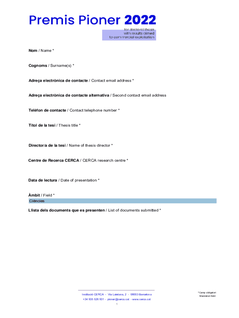 Nom / Name *Cognoms / Surname(s) *Adrea electrnica de contacte / Contact email address *Adrea electrnica de contacte alternativa / Second contact email addressTelfon de contacte / Contact telephone