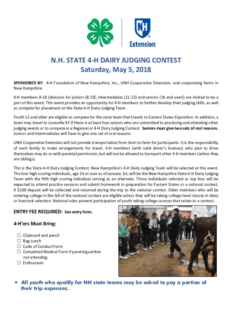 The N.H. State 4-H Dairy Judging Contest is an opportunity for 4-H members aged 8-18 to develop their judging skills and compete for placement on the State 4-H Dairy Judging Team. Participants will