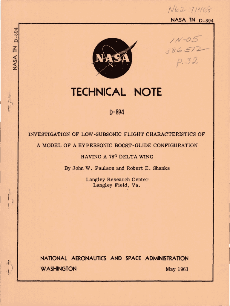 This technical note presents an investigation into the low-subsonic stability and control characteristics of a hypersonic boost-glide configuration model, focusing on its flight characteristics over