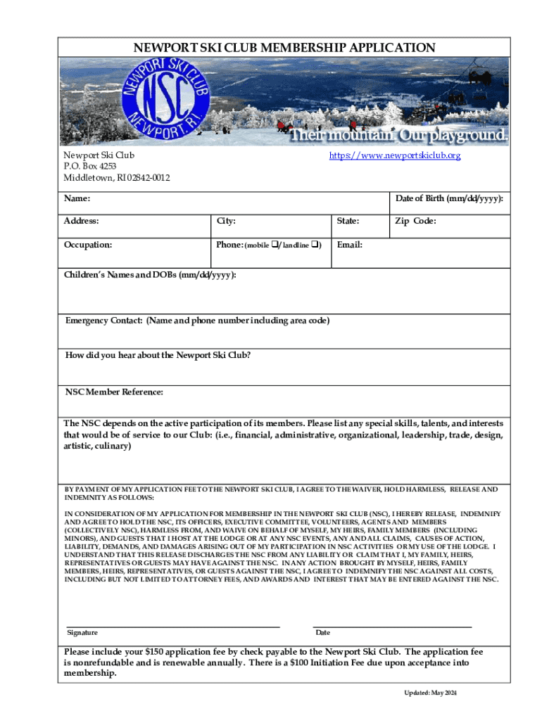 This document serves as an application form for joining the Newport Ski Club, requiring personal information, emergency contact details, and an endorsement of the club’s terms and conditions. It