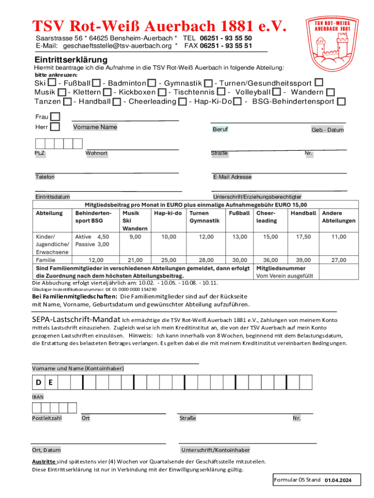Diese Eintrittserklärung dient der Beantragung der Aufnahme in die TSV Rot-Weiß Auerbach und bietet Optionen zur Auswahl von Abteilungen sowie die Erfassung von persönlichen Daten für die Vereinsmitgliedschaft.