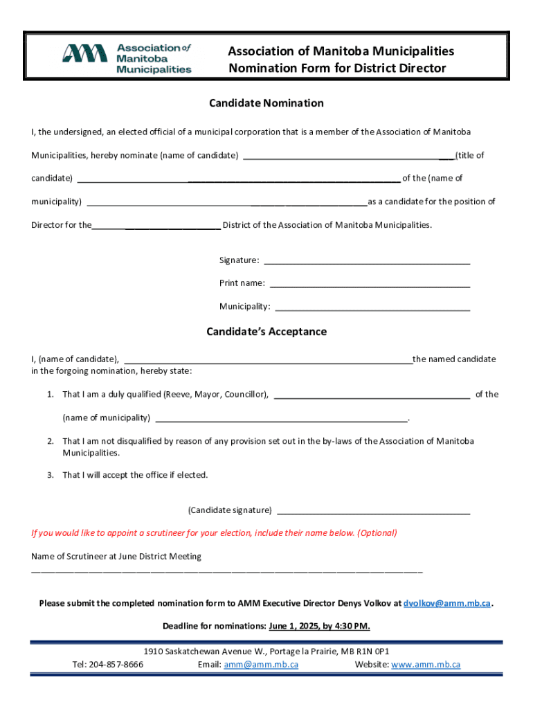 This form is used to nominate a candidate for the position of District Director within the Association of Manitoba Municipalities. It requires the signature of the nominator and the candidate\'s acceptance