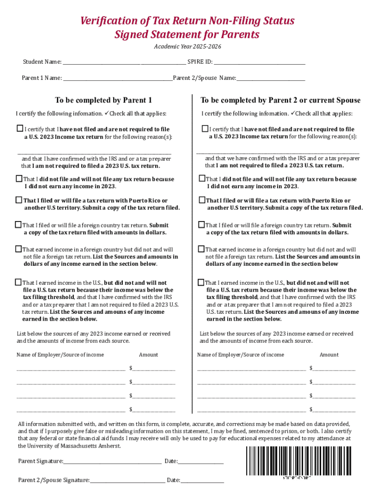 This document is a signed statement for parents to certify their non-filing status for tax returns for the academic year 2025-2026. It includes sections for both parents to certify that they have
