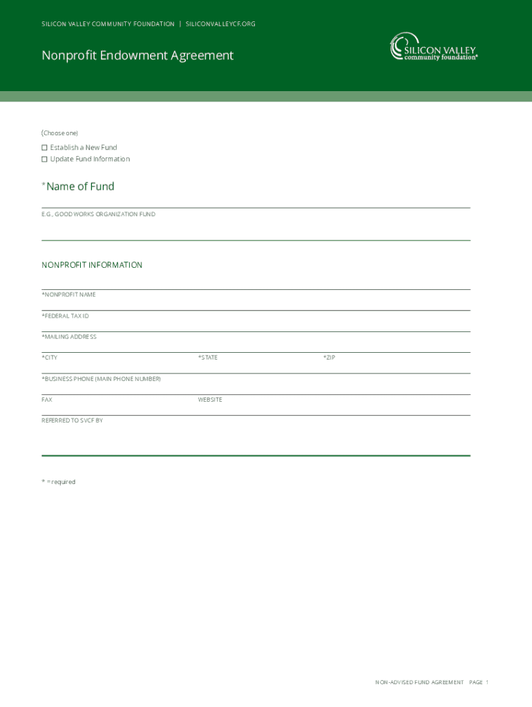 Este acuerdo permite a una organización sin fines de lucro establecer un fondo de dotación con la Fundación Comunitaria de Silicon Valley. Incluye información sobre la creación del fondo, políticas