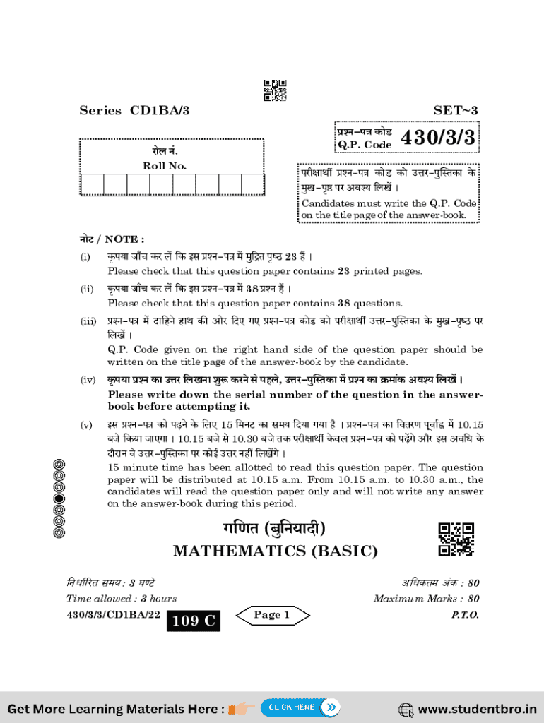 This document contains a question paper for Mathematics (Basic) with various sections including Multiple Choice Questions, Very Short Answer Questions, Short Answer Questions, Long Answer Questions,