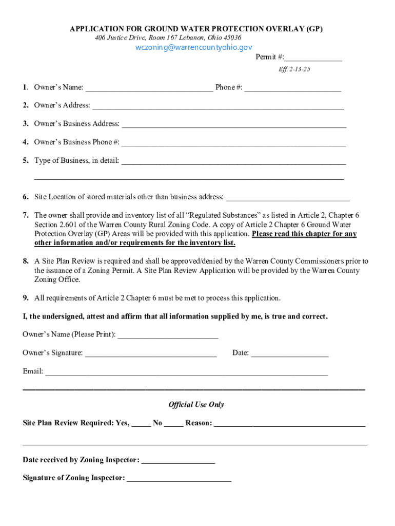 This application is required for obtaining a zoning permit related to the Ground Water Protection Overlay in Warren County. It necessitates comprehensive details from the owner regarding their business,