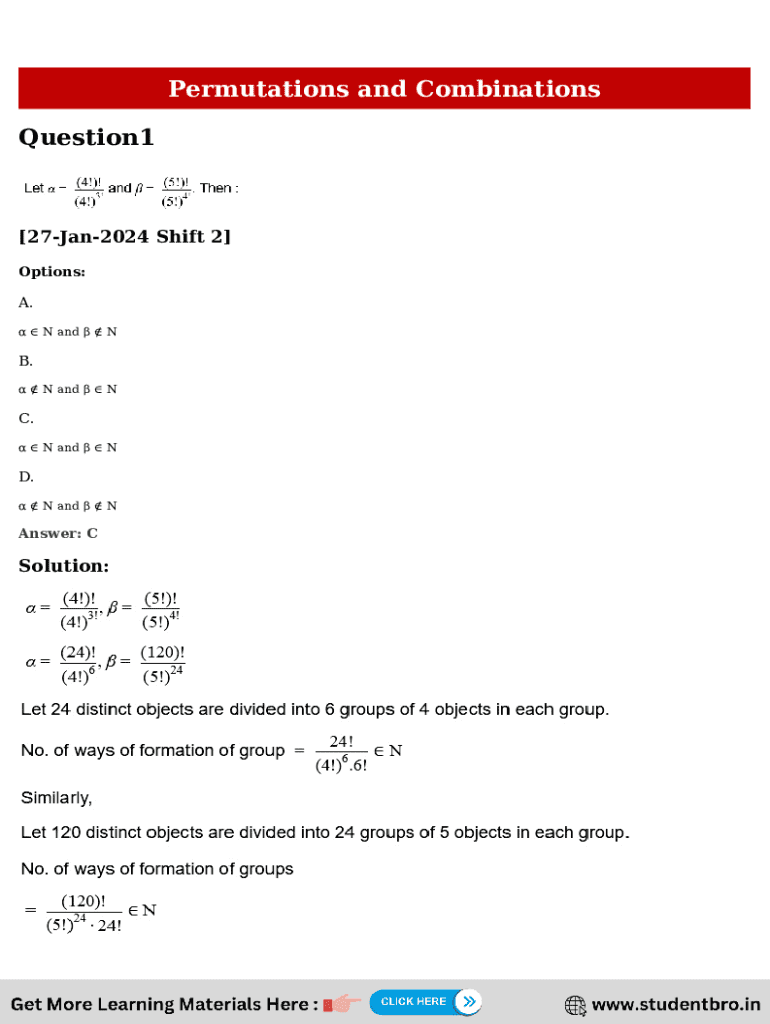 Permutations and Combinations Question1[27Jan2024 Shift 2] Options:A. N and NB. N and NC. N and ND. N and NAnswer: CSolution:www.studentbro.in www.studentbro.in www.studentbro.inQuestion2 All the