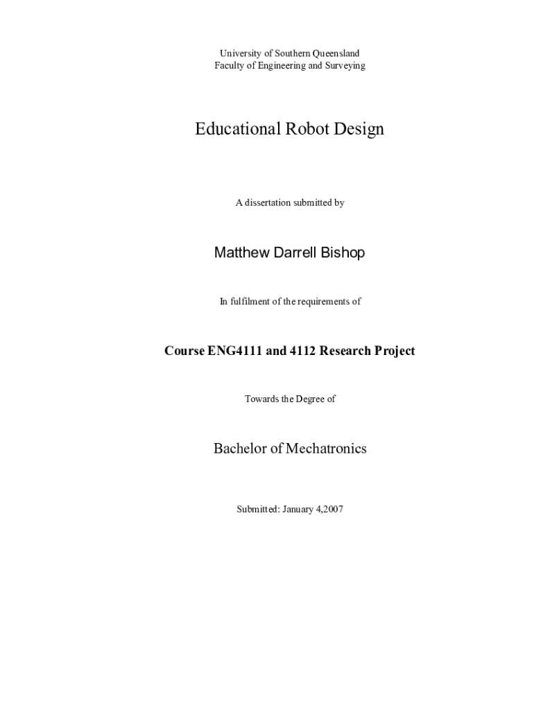 This dissertation presents a design for a small educational robot aimed at primary school students, focusing on integrating engineering principles in classroom settings. It includes details on the