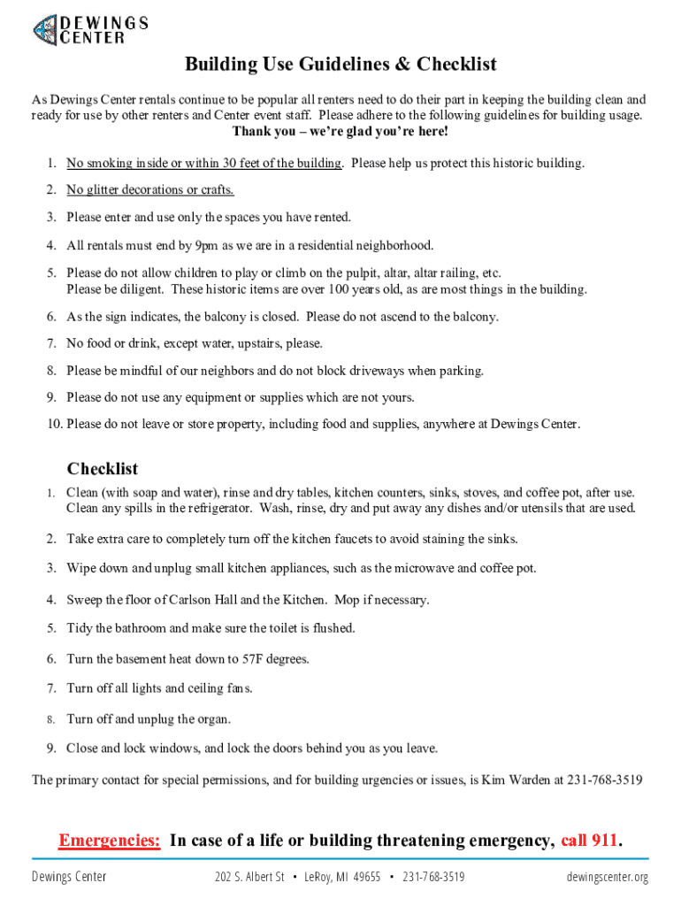 This document outlines the guidelines and checklist for renting spaces at Dewings Center, including rules for building use, cleaning responsibilities, and rental rates.