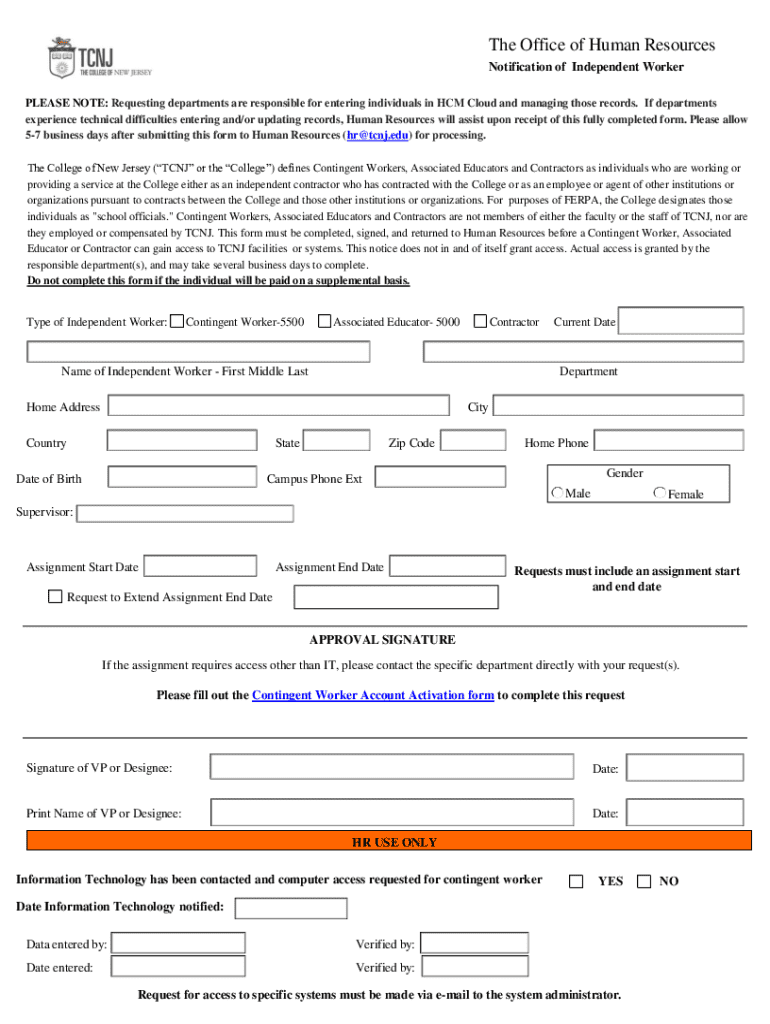 This form is used by departments at The College of New Jersey to notify Human Resources about the hiring of Contingent Workers, Associated Educators, and Contractors. It must be fully completed, signed,