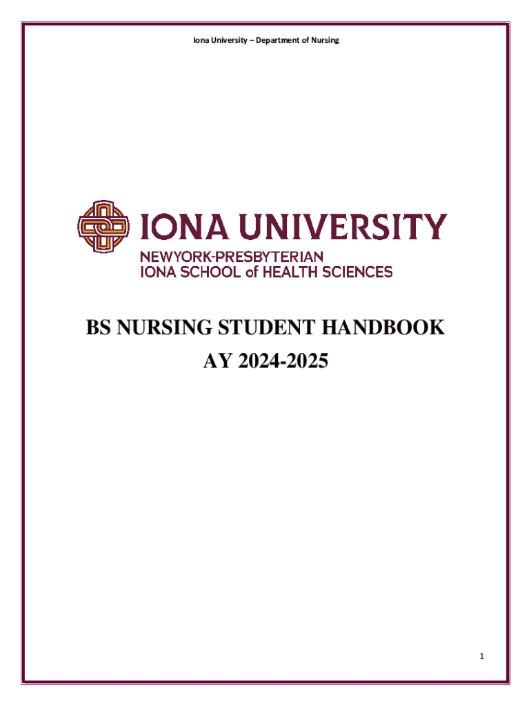 El Manual del Estudiante de Enfermería de Iona University para el año académico 2024-2025 proporciona una guía sobre las políticas y procedimientos del programa de enfermería, diseñado para