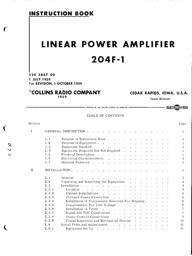 This instruction book contains detailed instructions for the installation, operation, and maintenance of the Linear Power Amplifier 204F-1, a three-stage amplifier designed for amplifying low-power
