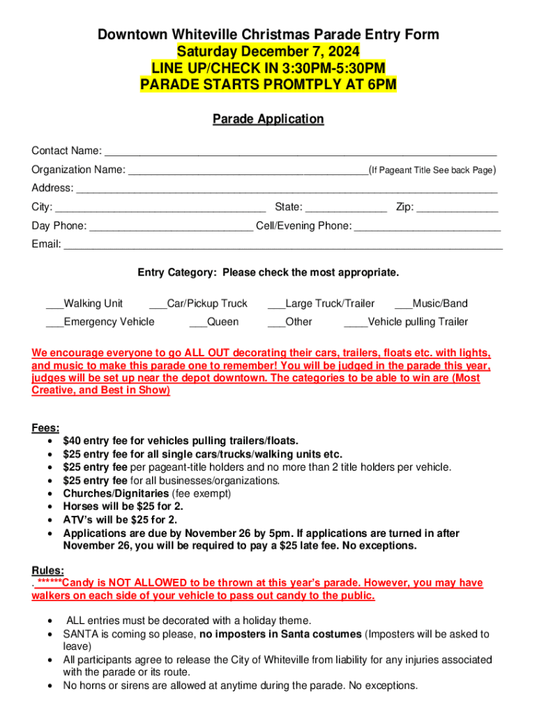 This form is for entering the Downtown Whiteville Christmas Parade scheduled on December 7, 2024. Participants must provide information including contact details, entry category, and agree to the