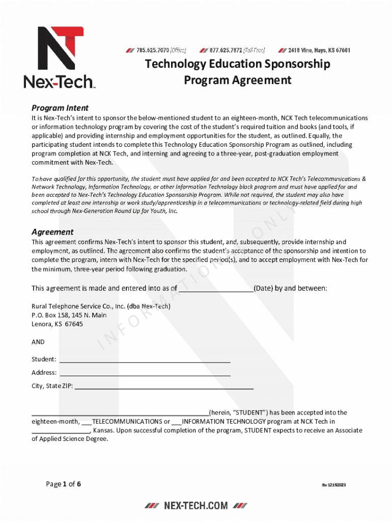 This agreement outlines the sponsorship of students by Nex-Tech for an eighteen-month program at NCK Tech, covering tuition, books, and tools, while requiring a commitment to a three-year employment