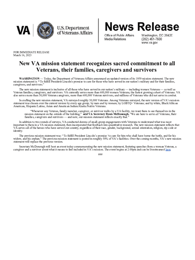 FOR IMMEDIATE RELEASE March 16, 2023New VA mission statement recognizes sacred commitment to all Veterans, their families, caregivers and survivors WASHINGTON Today, the Department of Veterans Affairs