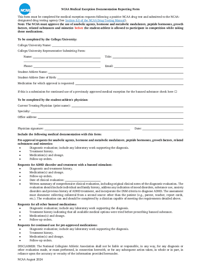 This form must be completed for medical exception requests following a positive NCAA drug test and submitted to the NCAA designated drug testing agency as per the guidelines outlined in the NCAA Drug-Testing