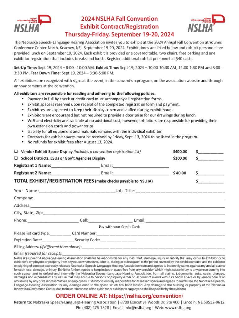 El contrato de exhibición para la Convención de Otoño de NSLHA de 2024 incluye información sobre el registro de exhibidores, costos, horarios y políticas importantes. Los expositores deben seguir