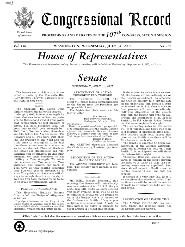 URIB UUE PLNUCongressional RecordMSUnited States of AmericaPROCEEDINGS AND DEBATES OF THEVol. 148107 th CONGRESS, SECOND SESSIONWASHINGTON, WEDNESDAY, JULY 31, 2002No. 107House of Representatives