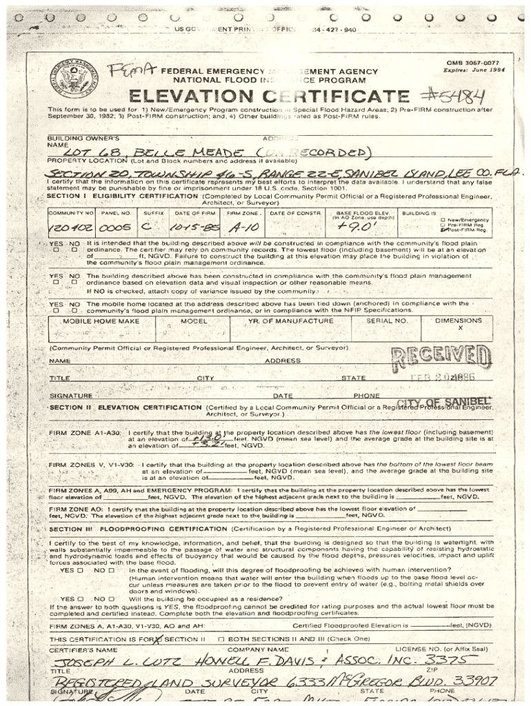This form is used for certifying compliance with floodplain management regulations for construction in areas subject to flooding. It includes sections for eligibility certification, elevation certification,