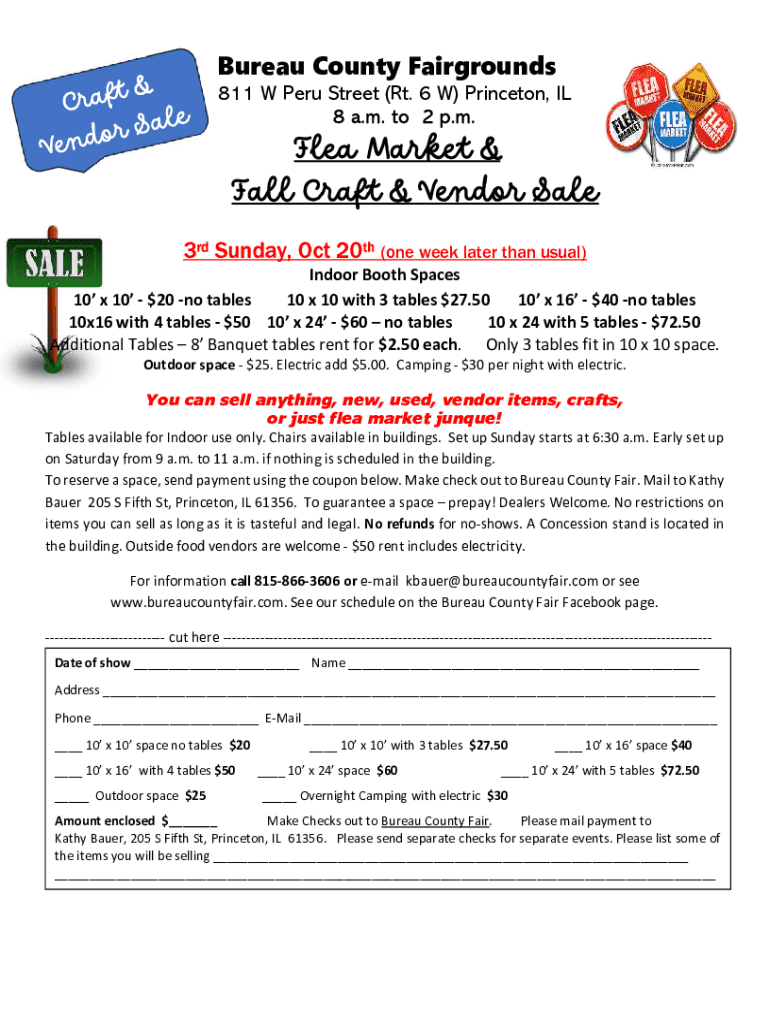 Registration form for vendors participating in the Bureau County Fair\'s Flea Market and Fall Craft & Vendor Sale. Details on booth sizes, rental prices, and additional services for vendors are provided.