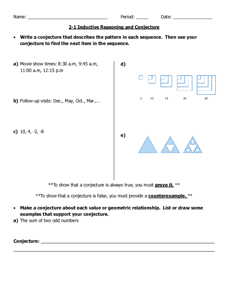 Name:Period: ___Date: ___21 Inductive Reasoning and Conjecture Write a conjecture that describes the pattern in each sequence. Then use your conjecture to find the next item in the sequence.a) Movie