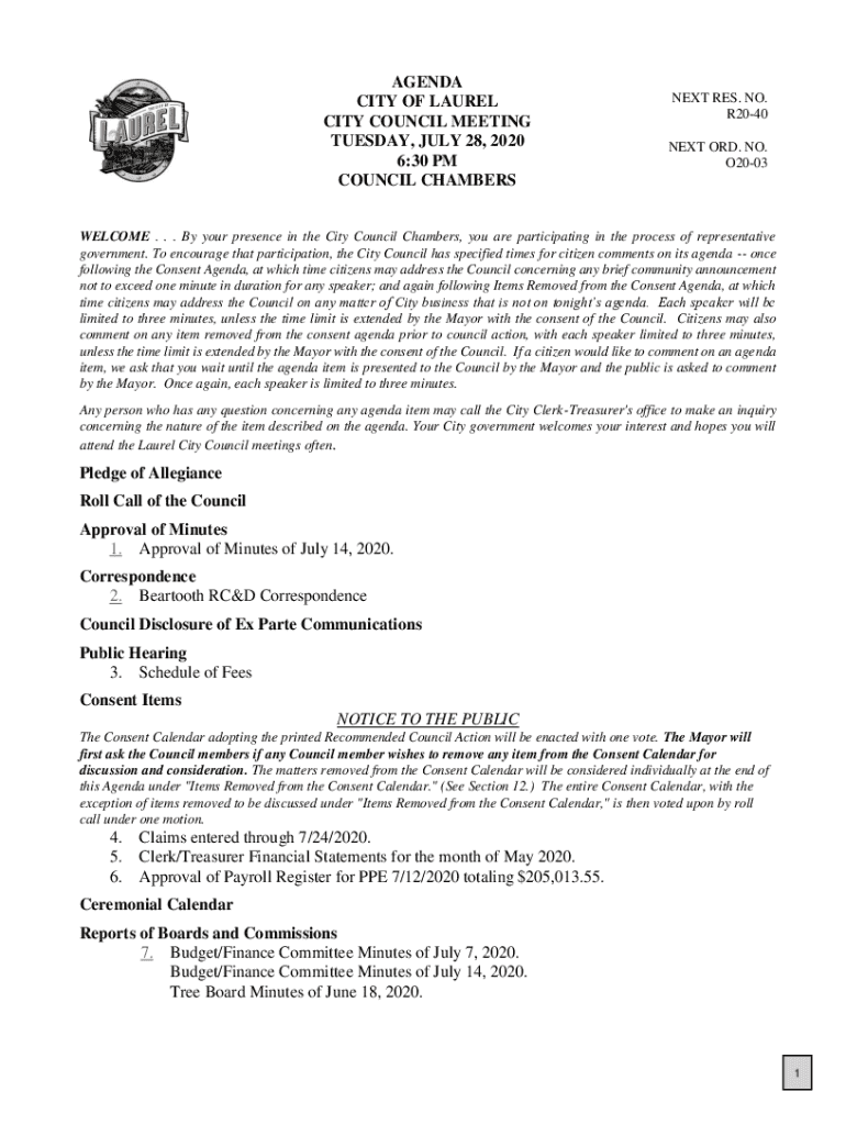 AGENDA CITY OF LAUREL CITY COUNCIL MEETING TUESDAY, JULY 28, 2020 6:30 PM COUNCIL CHAMBERSNEXT RES. NO. R2040 NEXT ORD. NO. O2003WELCOME . . . By your presence in the City Council Chambers, you are