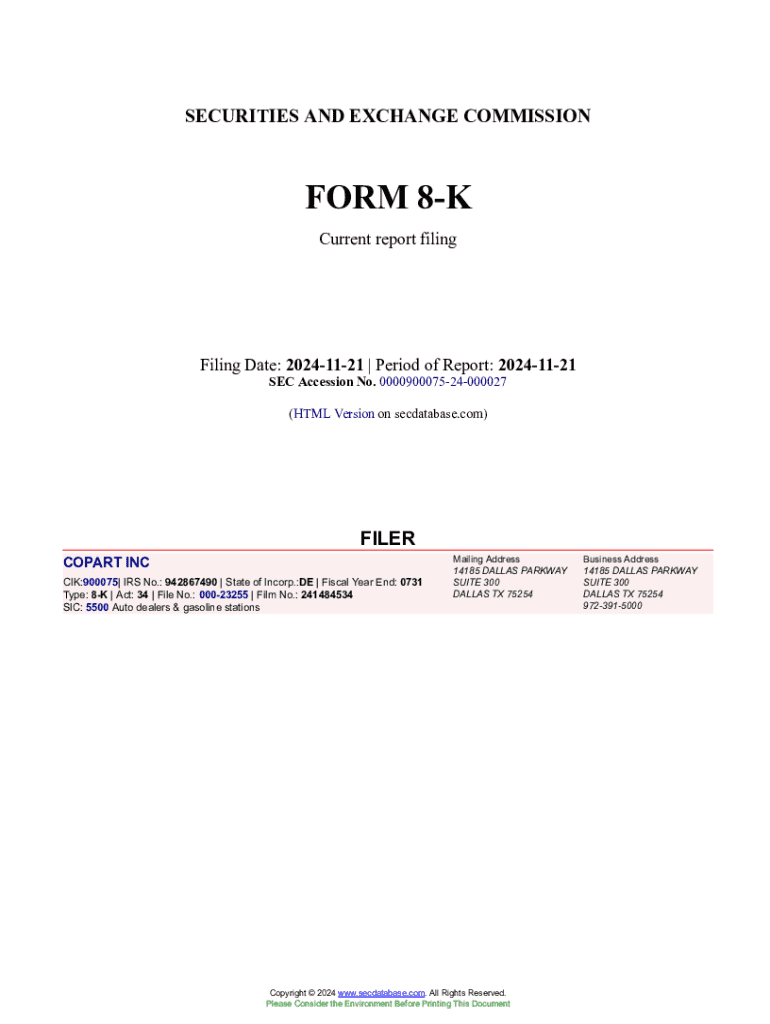 This document is a current report filed with the SEC by Copart, Inc., providing information regarding the financial results for the first quarter of fiscal year 2025, ending October 31, 2024.