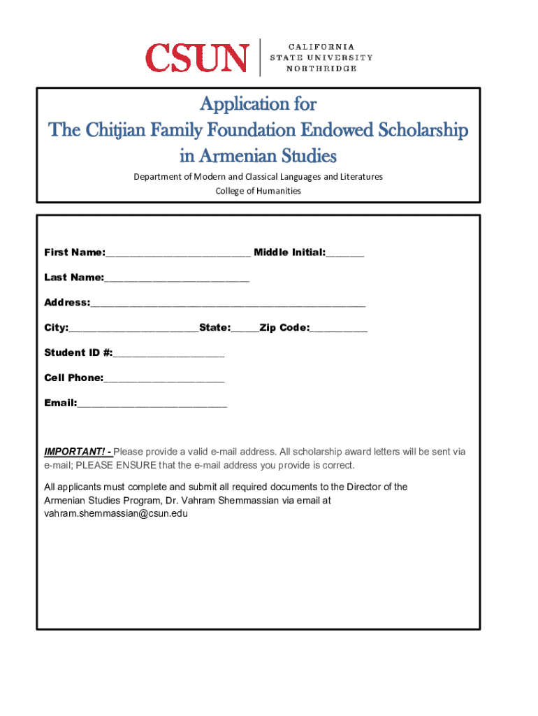 This document is an application form for the Chitjian Family Foundation Endowed Scholarship offered in the field of Armenian Studies at the Department of Modern and Classical Languages and Literatures,