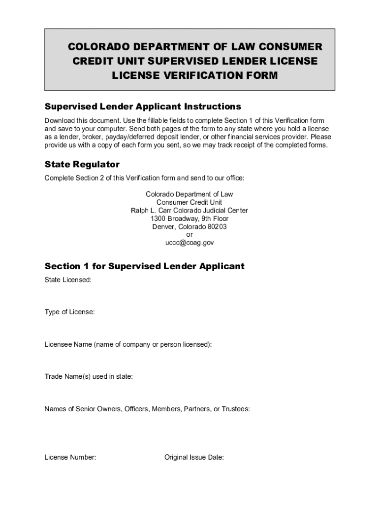This form is used for verifying the license of supervised lenders. Applicants are instructed to complete Section 1 and send it to states where they hold a lending license. State regulators will complete