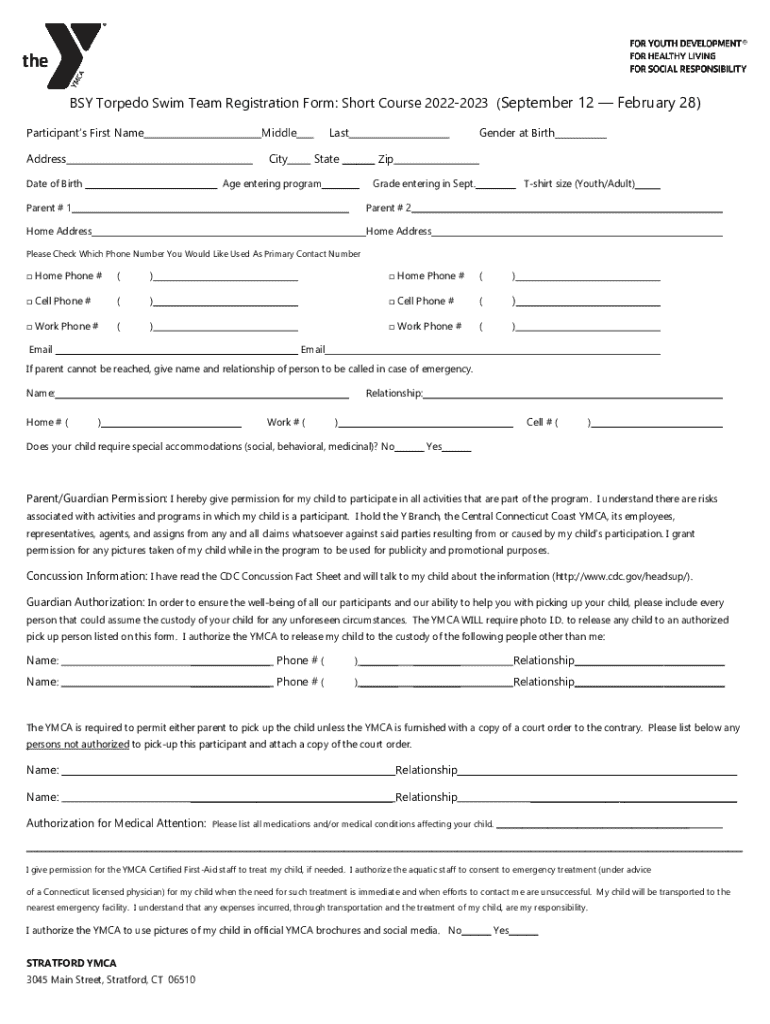 This form is used to register participants for the BSY Torpedo Swim Team\'s Short Course season from September 12 to February 28. It collects essential participant information, medical details, and