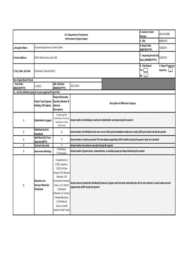 This report outlines the progress of the Colorado Department of Public Safety in implementing a grant funded project, detailing the activities conducted, metrics achieved, stakeholder engagements,