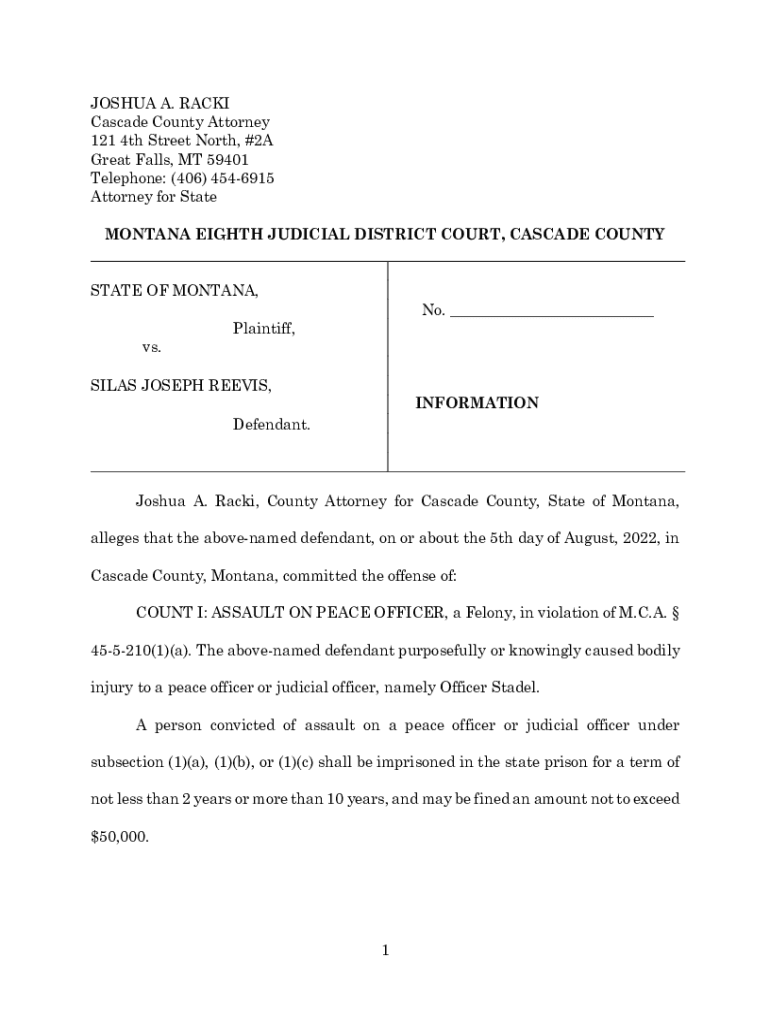 JOSHUA A. RACKI Cascade County Attorney 121 4th Street North, #2A Great Falls, MT 59401 Telephone: (406) 4546915 Attorney for State MONTANA EIGHTH JUDICIAL DISTRICT COURT, CASCADE COUNTY STATE OF