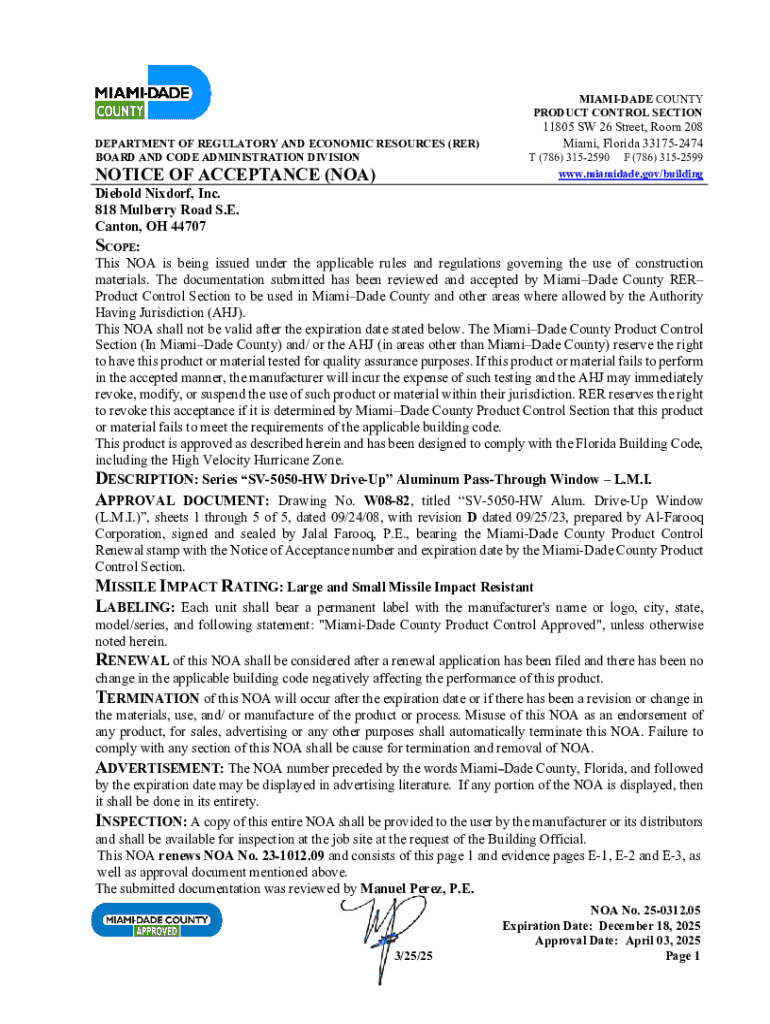This document is a Notice of Acceptance (NOA) issued by the Miami-Dade County Product Control Section for the approval of the Series \'SV-5050-HW Drive-Up\' Aluminum Pass-Through Window. It outlines