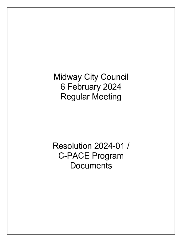 Midway City Council 6 February 2024 Regular MeetingResolution 202401 / CPACE Program DocumentsRESOLUTION 202301 A RESOLUTION ADOPTING VARIOUS DOCUMENTS FOR THE HOMESTEAD RESORT TO UTILIZE COMMERCIAL