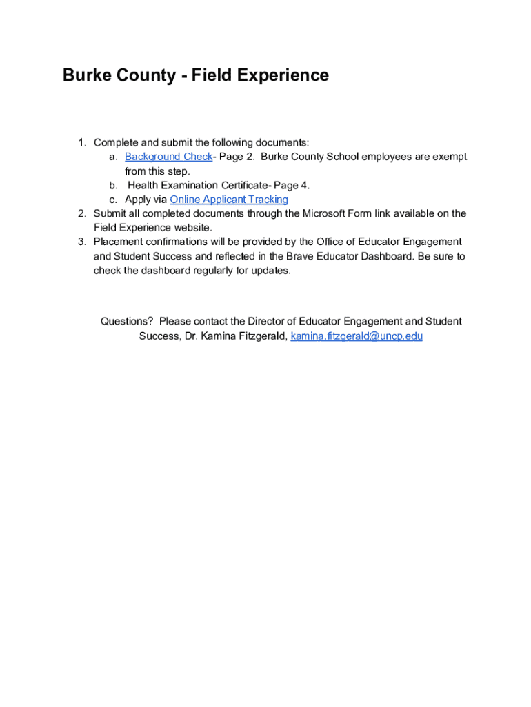 This document outlines the necessary steps and documents required for field experience placements in Burke County Public Schools, including background checks, health examination certificates, and