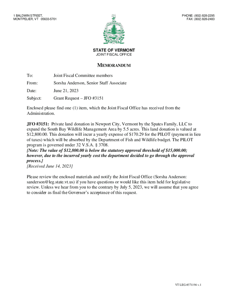 This memorandum outlines the donation of 5.5 acres of land by the Spates Family, LLC to the Joint Fiscal Office for expansion of the South Bay Wildlife Management Area in Newport City, Vermont. The