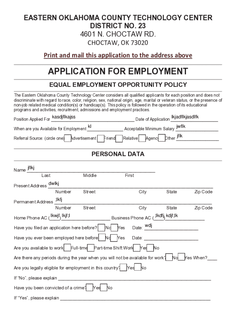 This application is used for employment opportunities at the Eastern Oklahoma County Technology Center. It includes sections for personal data, education, employment history, and certifications. The