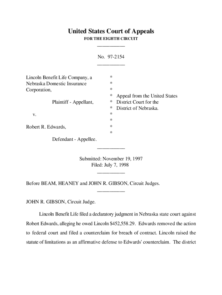 United States Court of Appeals FOR THE EIGHTH CIRCUIT___ No. 972154 ___ Lincoln Benefit Life Company, a Nebraska Domestic Insurance Corporation, Plaintiff Appellant, v. Robert R. Edwards,* * * * Appeal