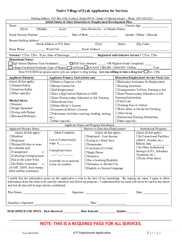 This application is for Child Care Assistance under The Native Village of Eyak’s 477 Program, available for eligible Alaska Natives and American Indians. The program supports income-eligible parents
