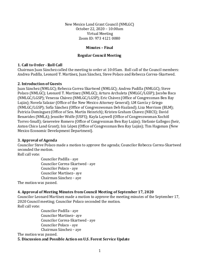 This document contains the final minutes of the New Mexico Land Grant Council\'s virtual meeting held on October 22, 2020. It includes details on the agenda, approval of minutes from the previous