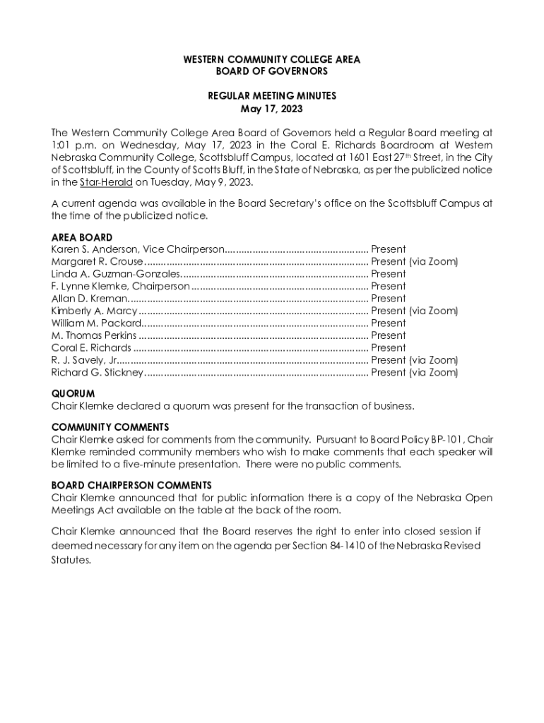 Minutes from the regular meeting held on May 17, 2023, covering various agenda items, board member attendance, community comments, financial approvals, personnel changes, and upcoming events.