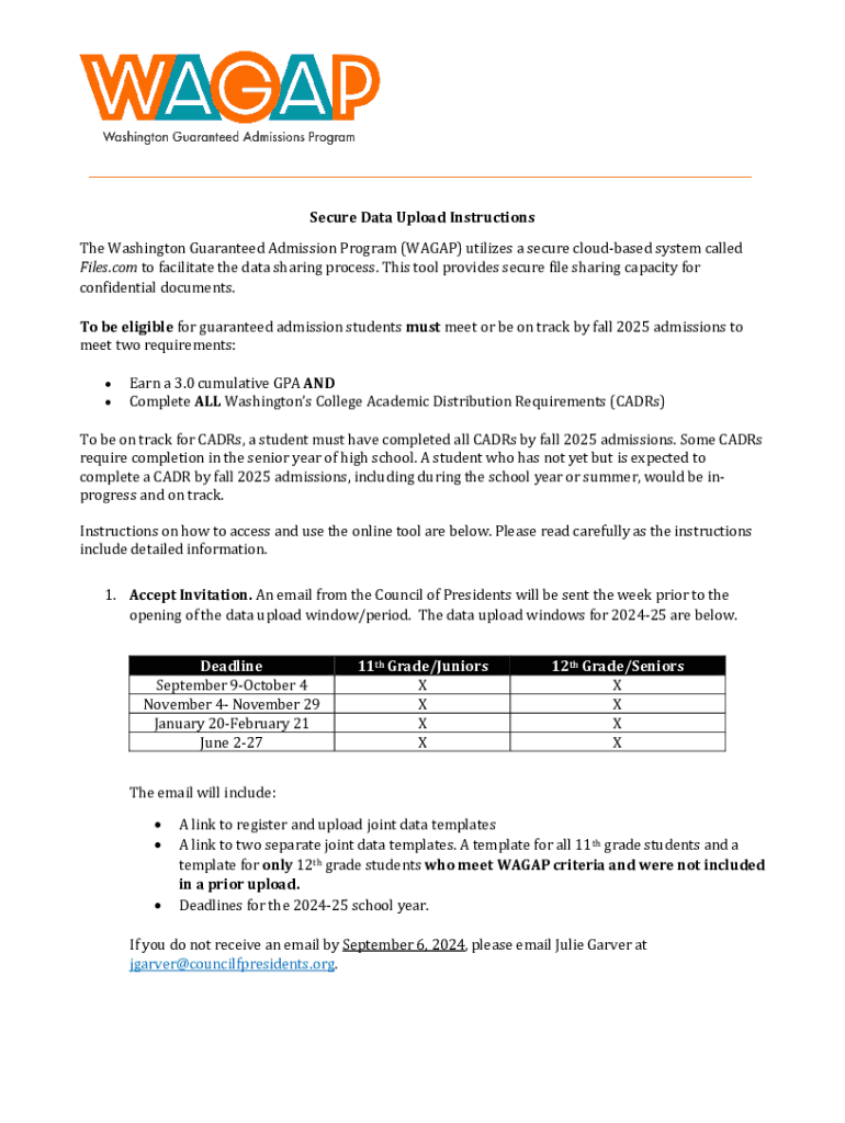 Instructions for utilizing the secure data upload system for the Washington Guaranteed Admission Program, outlining eligibility requirements, data submission deadlines, and detailed steps for data