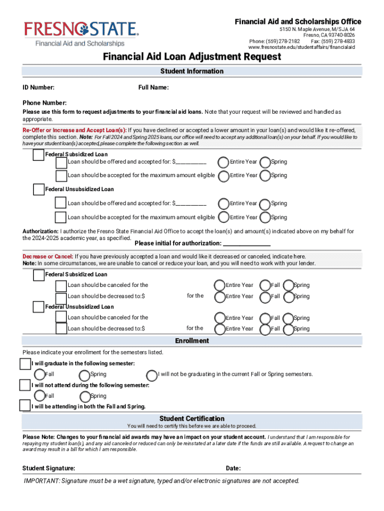 This form is used by students at Fresno State to request adjustments to their financial aid loans, including re-offering, increasing, decreasing, or canceling loans for the academic year.