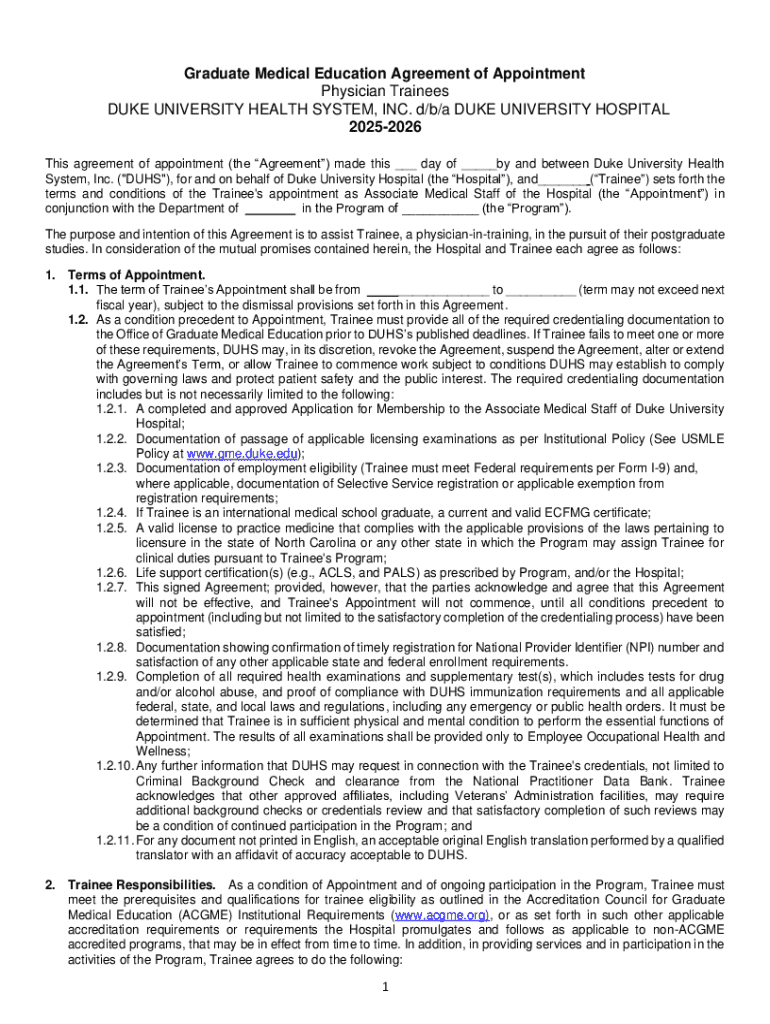 Get the free Graduate Medical Education Agreement of Appointment - gme duke