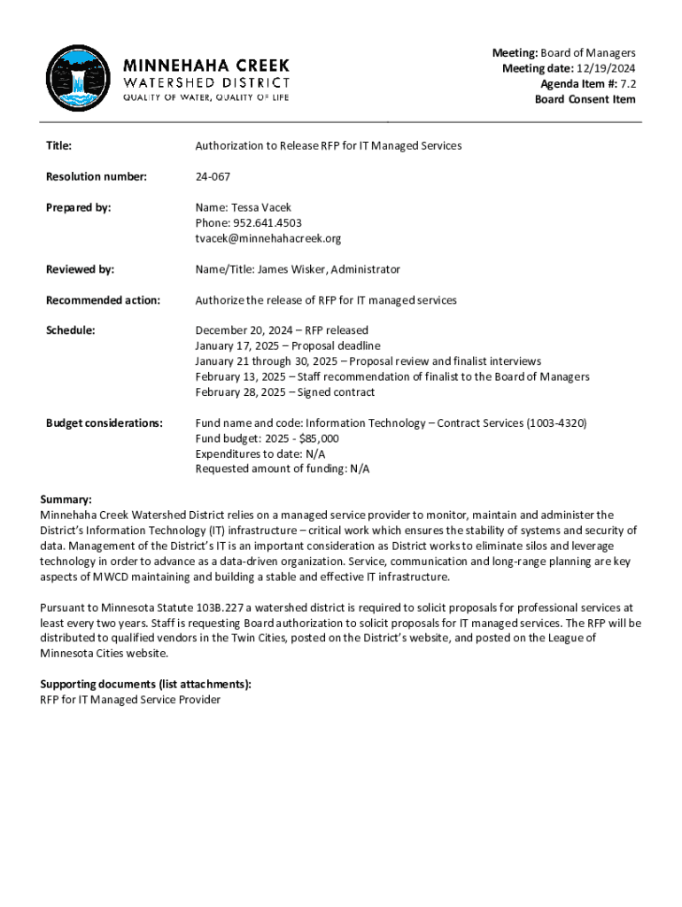 Meeting: Board of Managers Meeting date: 12/19/2024 Agenda Item #: 7.2 Board Consent ItemTitle:Authorization to Release RFP for IT Managed ServicesResolution number:24067Prepared by:Name: Tessa Vacek