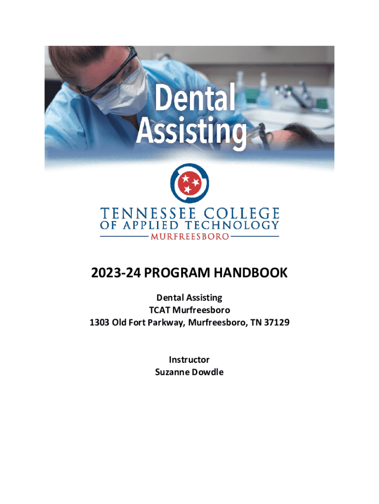 This handbook provides essential information regarding the Dental Assisting Program at TCAT Murfreesboro, including program objectives, evaluation methods, grading standards, clinical performance