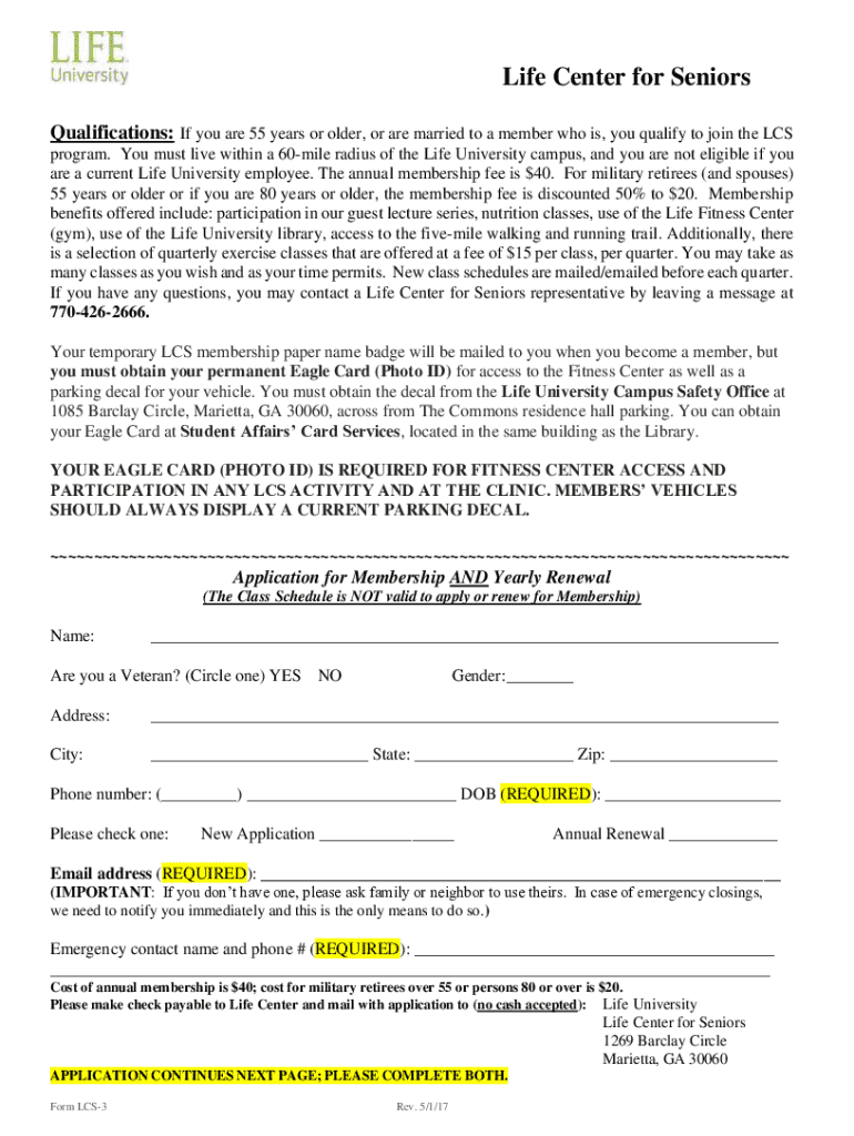 This document serves as an application form for membership to the Life Center for Seniors, detailing qualifications, membership fees, benefits, and the application process.